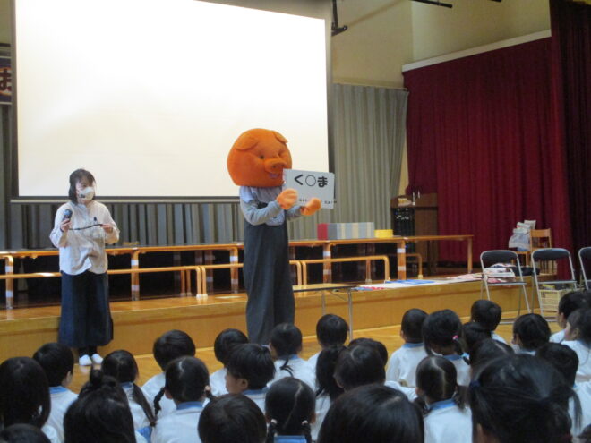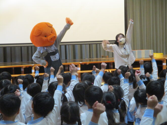 また別の日には、幼稚園で交通課のおまわりさんによる交通安全教室が開かれました。みんなで交通ルールを学べるアニメを観たり、マスコットのぶーちゃんと一緒にクイズや体操をして楽しく交通ルールを学びました。