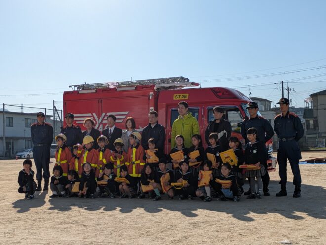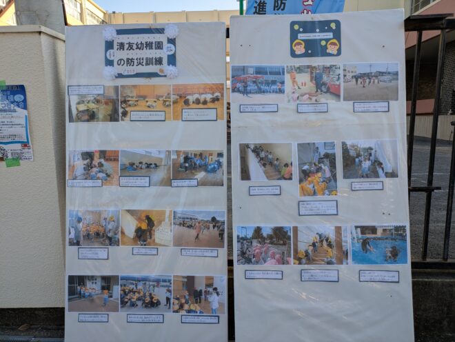 11月30日(日)刑部小学校で防災訓練が行われました。清友幼稚園からは年長の園児たちが参加しました。防災頭巾をかぶり、避難のポーズを取って日頃の訓練の成果を披露したり、消防署員さんと触れ合ったり、地域の方と一緒に防災について考える1日となりました。会場には園での日頃の避難訓練の様子を写したパネルも展示し、地域の方に園での防災に対する取り組みを見ていただく良い機会となりました。