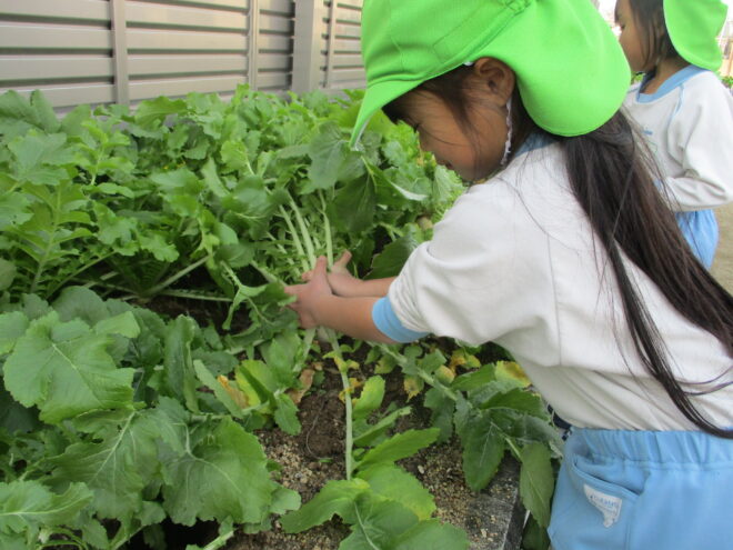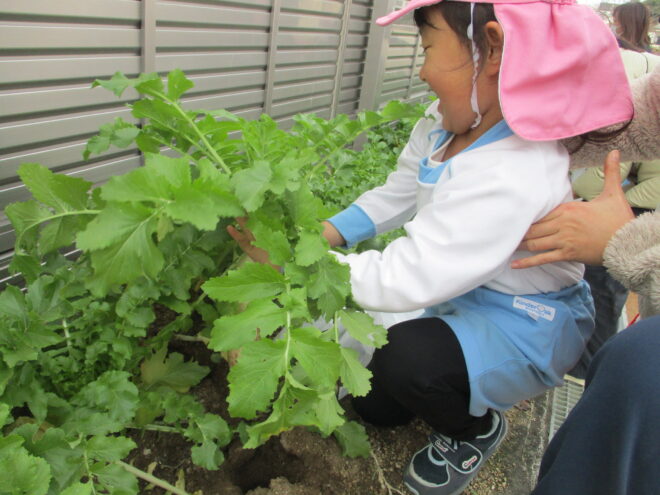 寒風吹きすさぶ1月、園庭の畑では立派な大根が育っていました。保護者の方にもお手伝いいただき、子ども達が収穫に臨みます。大きく育った大根は中々抜けませんが、「うんとこしょ、どっこいしょ」の掛け声で一生懸命引っ張る子ども達。引き抜けた時はとても嬉しそうな笑顔でした。